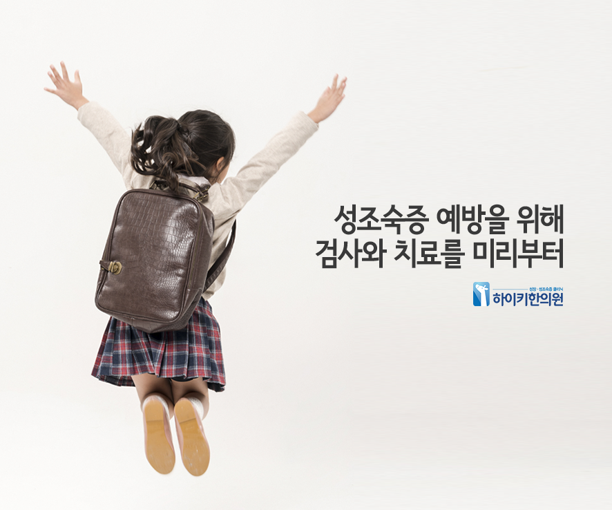 여아 초등학교 1~2학년 때부터는 성조숙증 예방을 위해 주기적으로 성조숙증 검사를 받는 것이 도움이 됩니다. 성조숙증 증상이 나타났거나 위험이 높다고 판단될 경우에는 성조숙증클리닉에서 검사 및 진료 그리고 상황에 맞게 치료를 진행한다면 성장흐름을 다시 바로 잡는데 큰 도움이 됩니다.