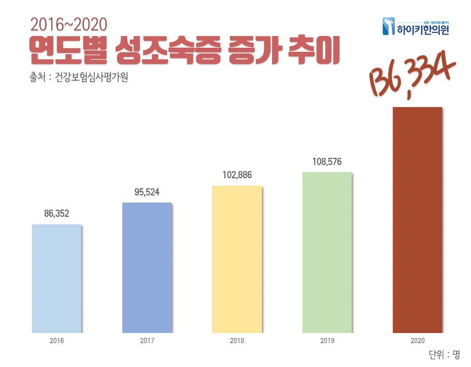 성조숙증이 증가 추세인 만큼 2020년에 증가했을거란 예상은 했지만, 이토록 과도하게 증가할거라는 건 쉽게 상상하기 힘들었습니다. 특히나 매년 소아청소년 인구는 줄어들고 있는 와중에 성조숙증은 급격하게 증가하니 이 문제에 대한 위기감이 더욱더 피부로 와닿게 되었습니다.